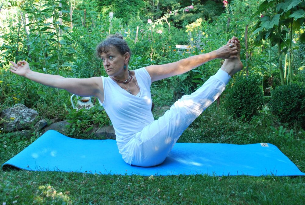 Mettetevi in posizione seduta e flettete le ginocchia unite, fino a portare i talloni vicini al bacino. Durante un’inspirazione, ruotate il busto verso sinistra ed espirando portate la mano destra ad afferrare il piede sinistro dal lato esterno. Tenendo i piedi ben serrati, inspirando sollevate le gambe fino a distenderle (in caso di impossibilità aiutatevi con una cintura/o cinghia per allungare le gambe) mentre anche il braccio sinistro si distende espandendo il petto. (Se non riuscite a mantenere l’equilibrio mantenete la mano inizialmente per terra per stabilizzare la postura). Le braccia risultano aperto sulla linea delle spalle e parallele al suolo. Il capo gira per guardare la mano sinistra (se non ci sono impedimenti per causa di tensioni alla cervicale, in tal caso è bene guardare in avanti). Mantenere la posizione con respiri calmi e regolari nell’immobilità per alcuni respiri, da 5 a 15, poi ripetere la posizione con le stesse modalità e tempi dall’altro lato.